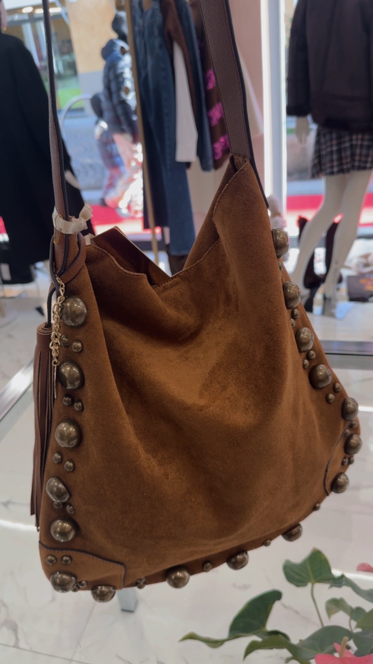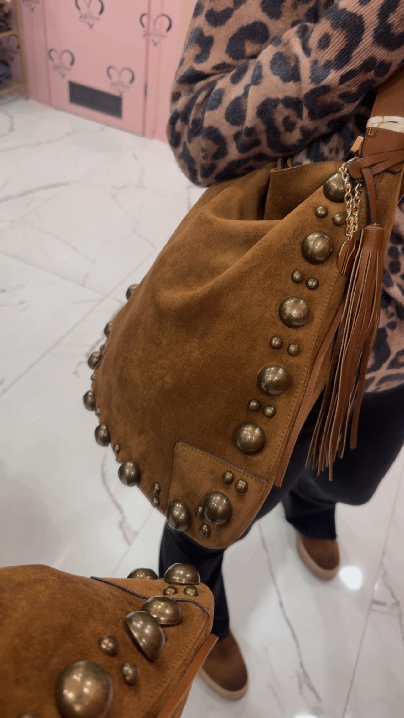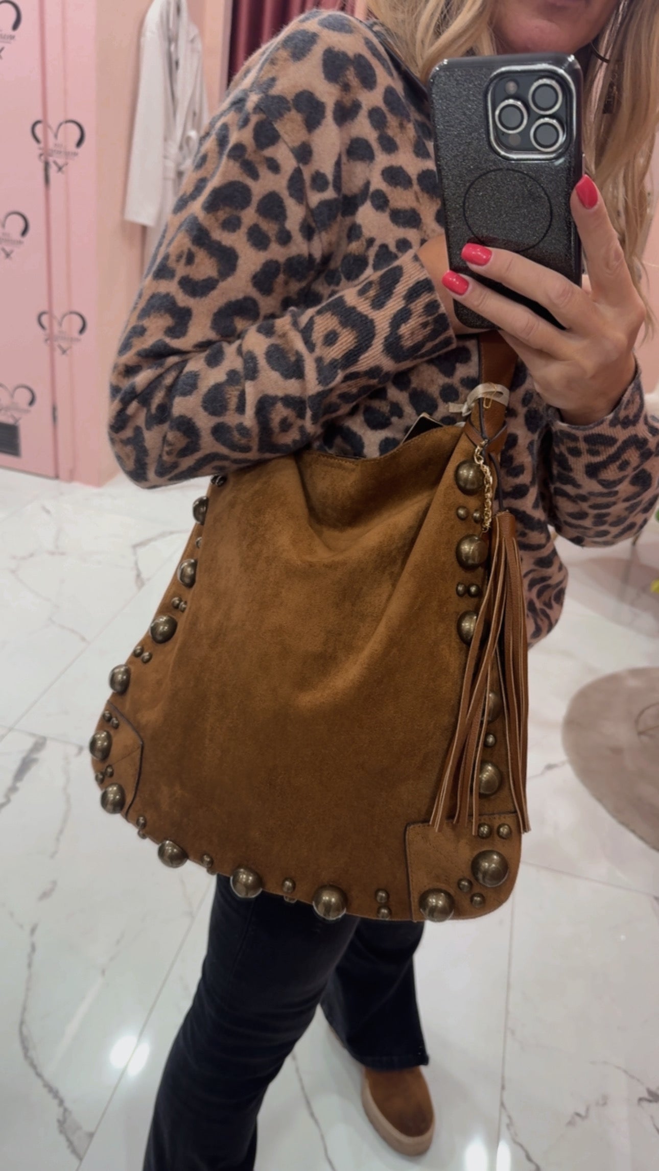 Borsa eco camoscio con manico in pelle e borchie , ciondolo e nappa