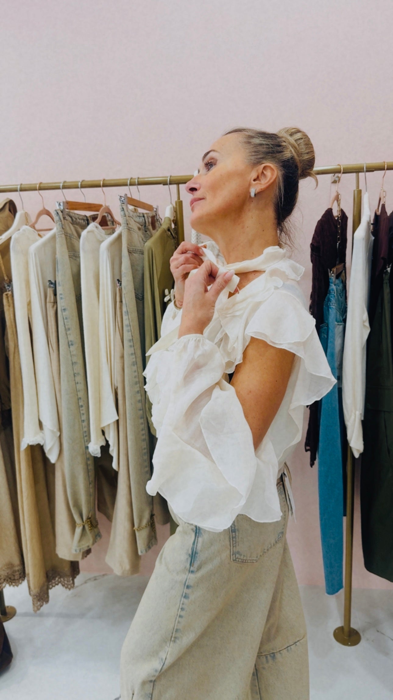 Camicia chiffon con rouges e oblò sulle spalle chiusura a fiocco