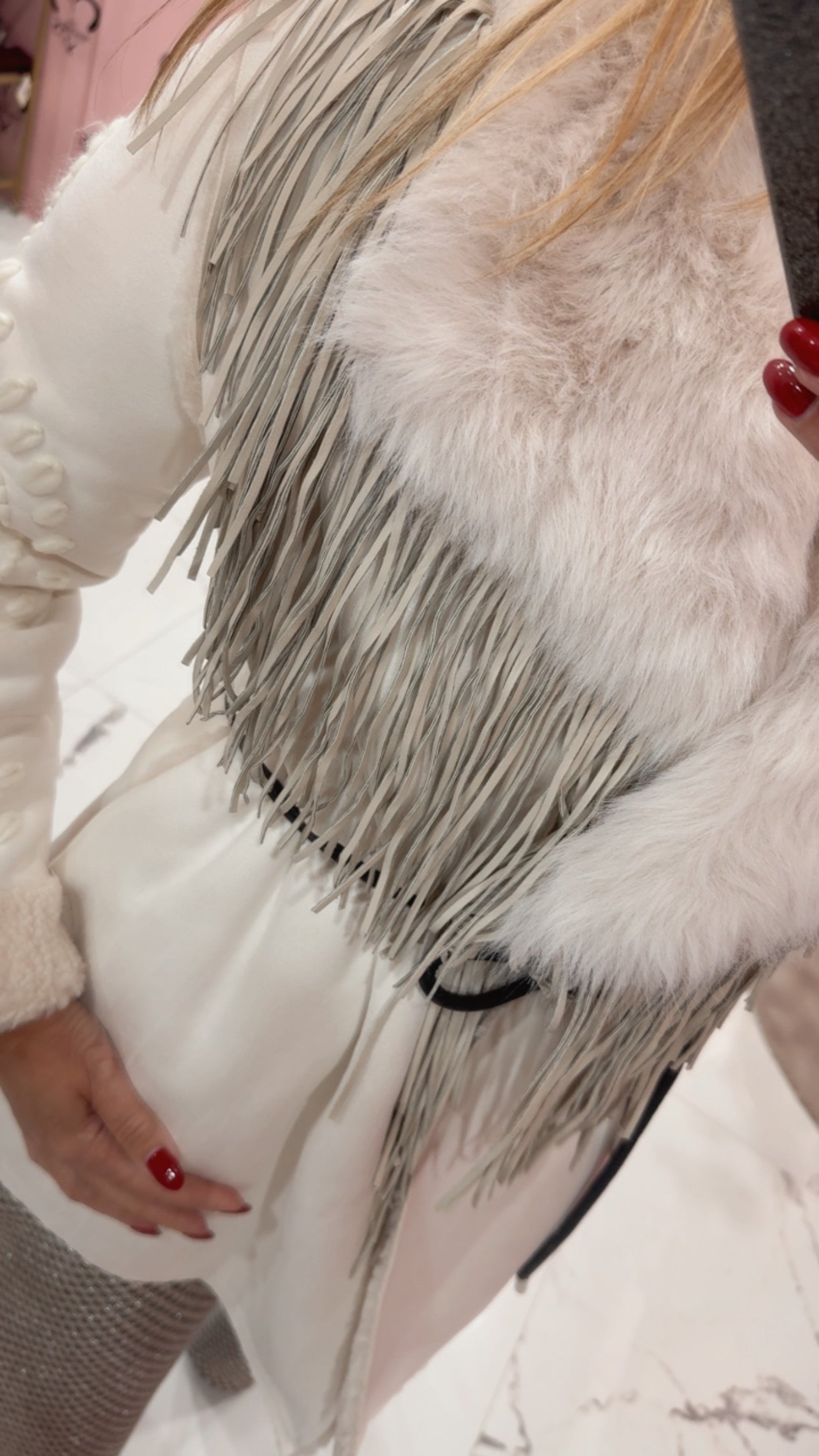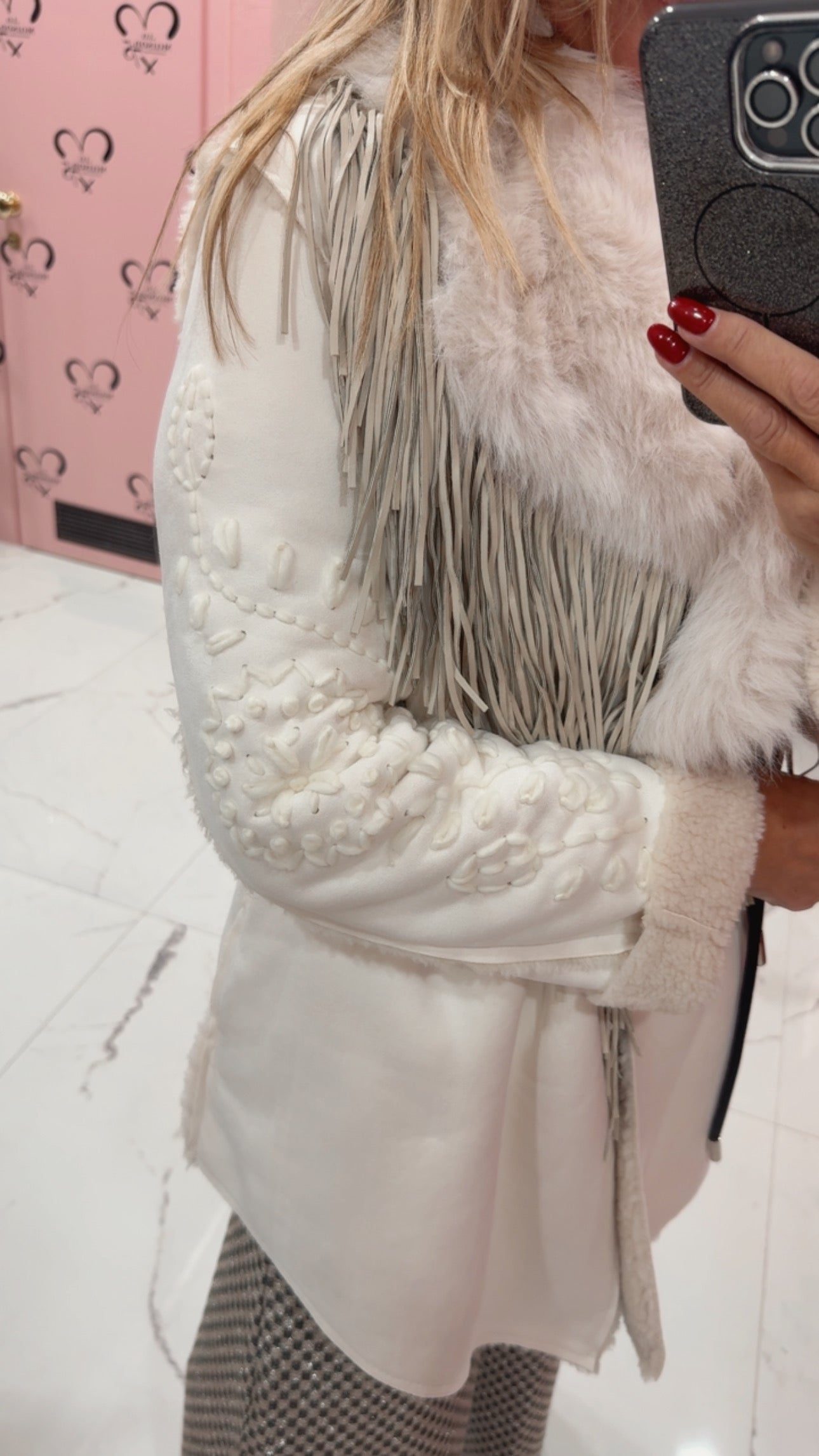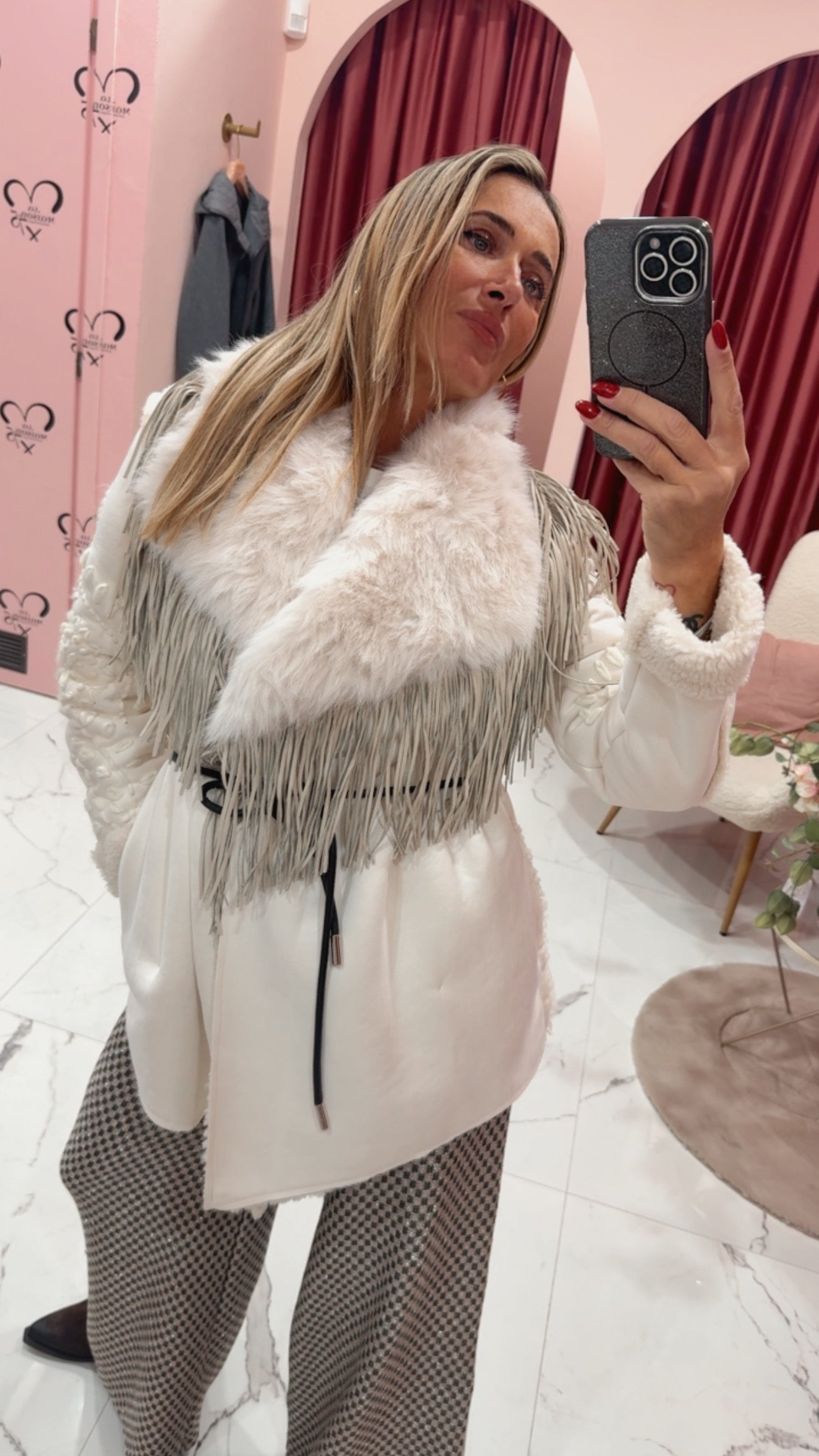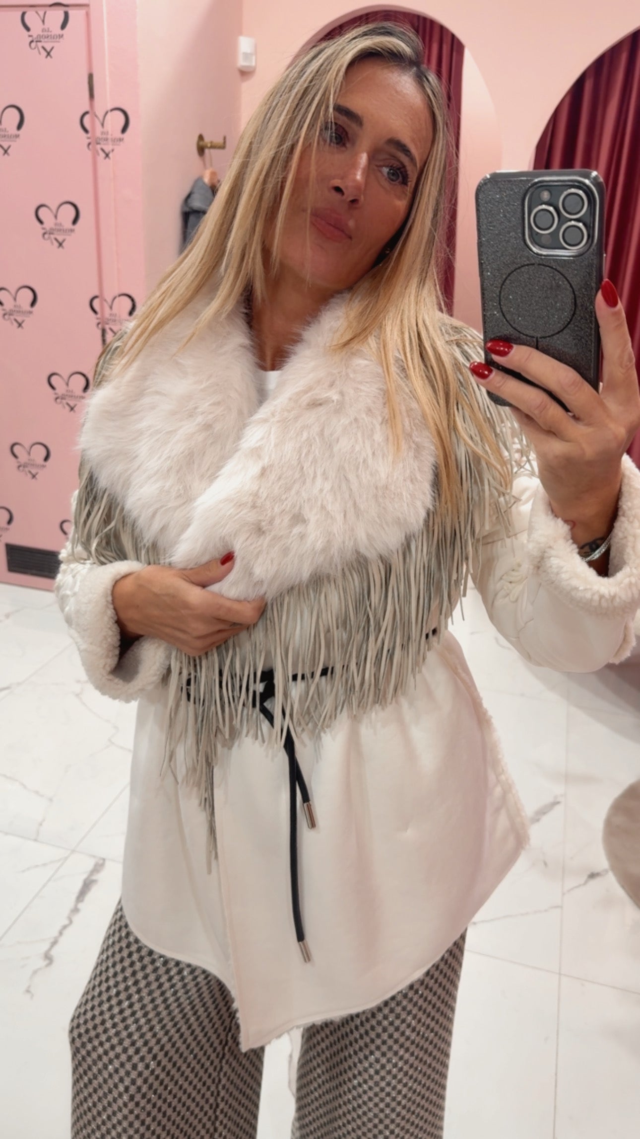 Ecomontone imbottito lana con decorazioni maglia sul braccio frange pelle e cintura