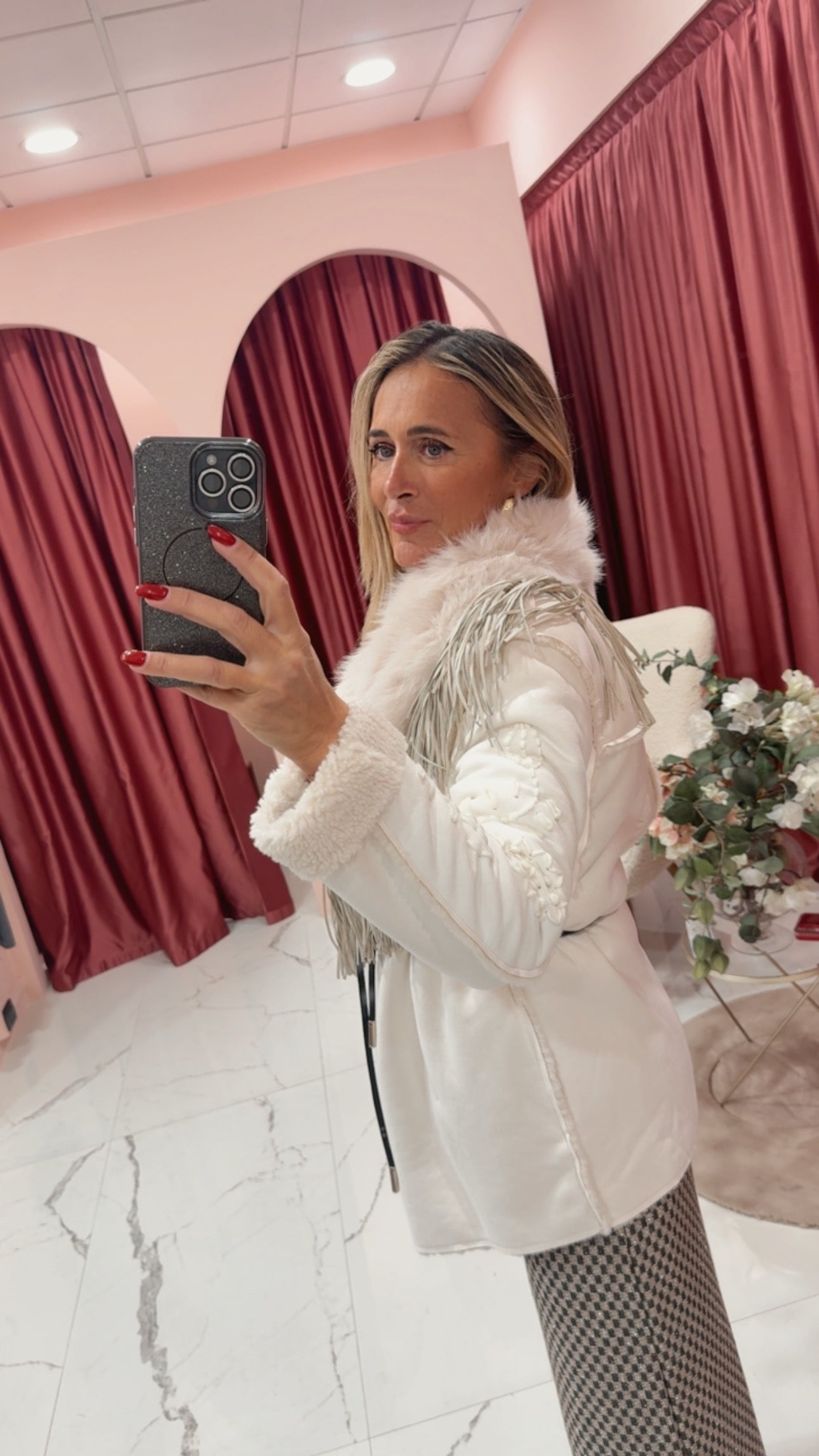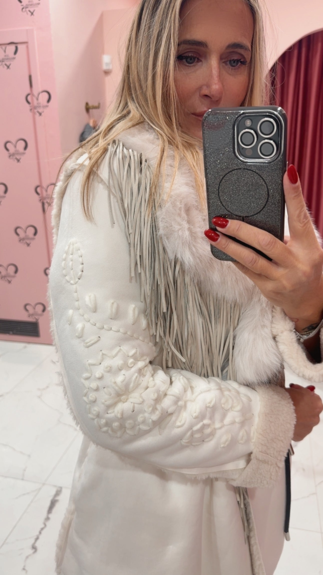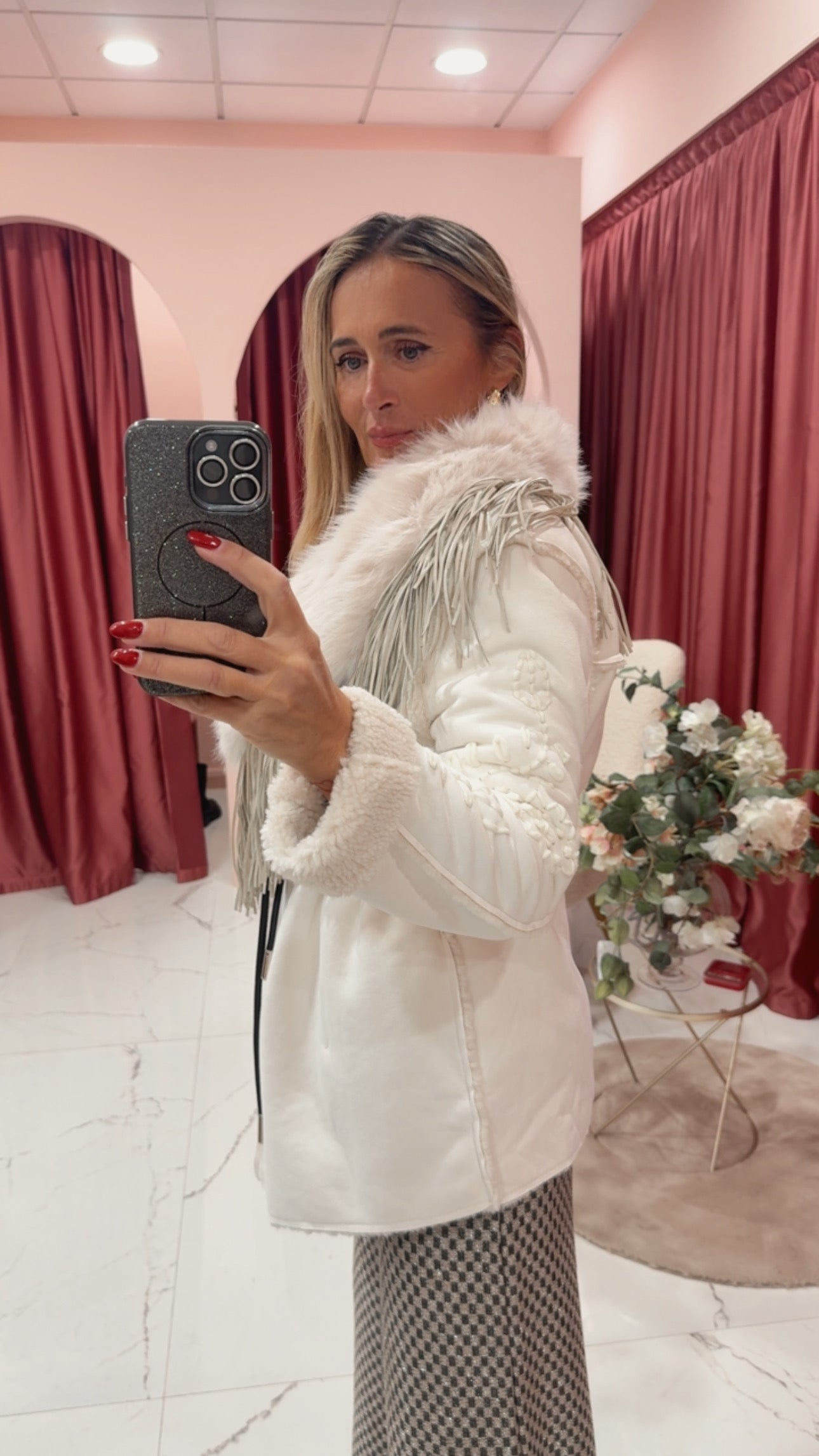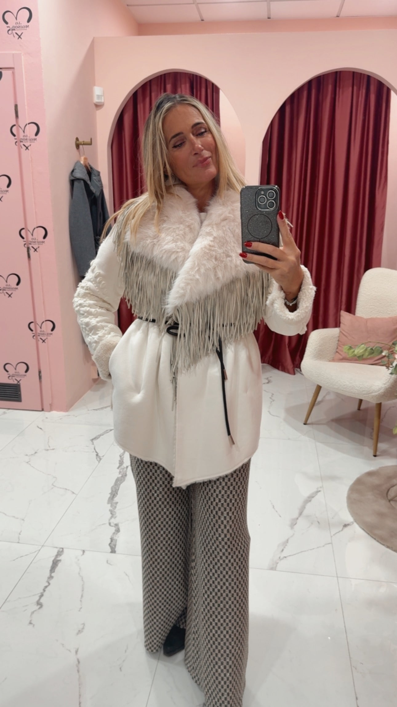 Ecomontone imbottito lana con decorazioni maglia sul braccio frange pelle e cintura