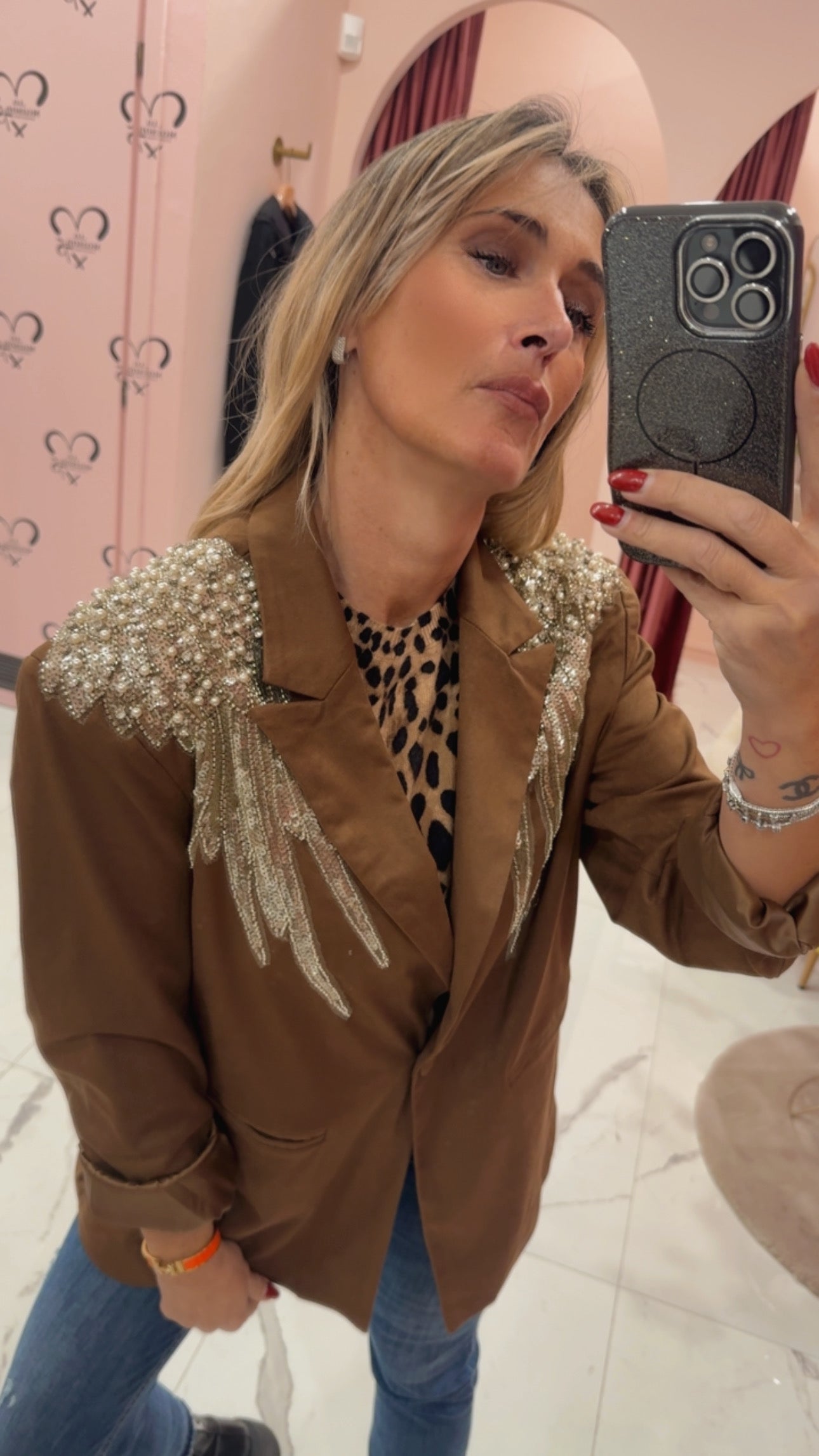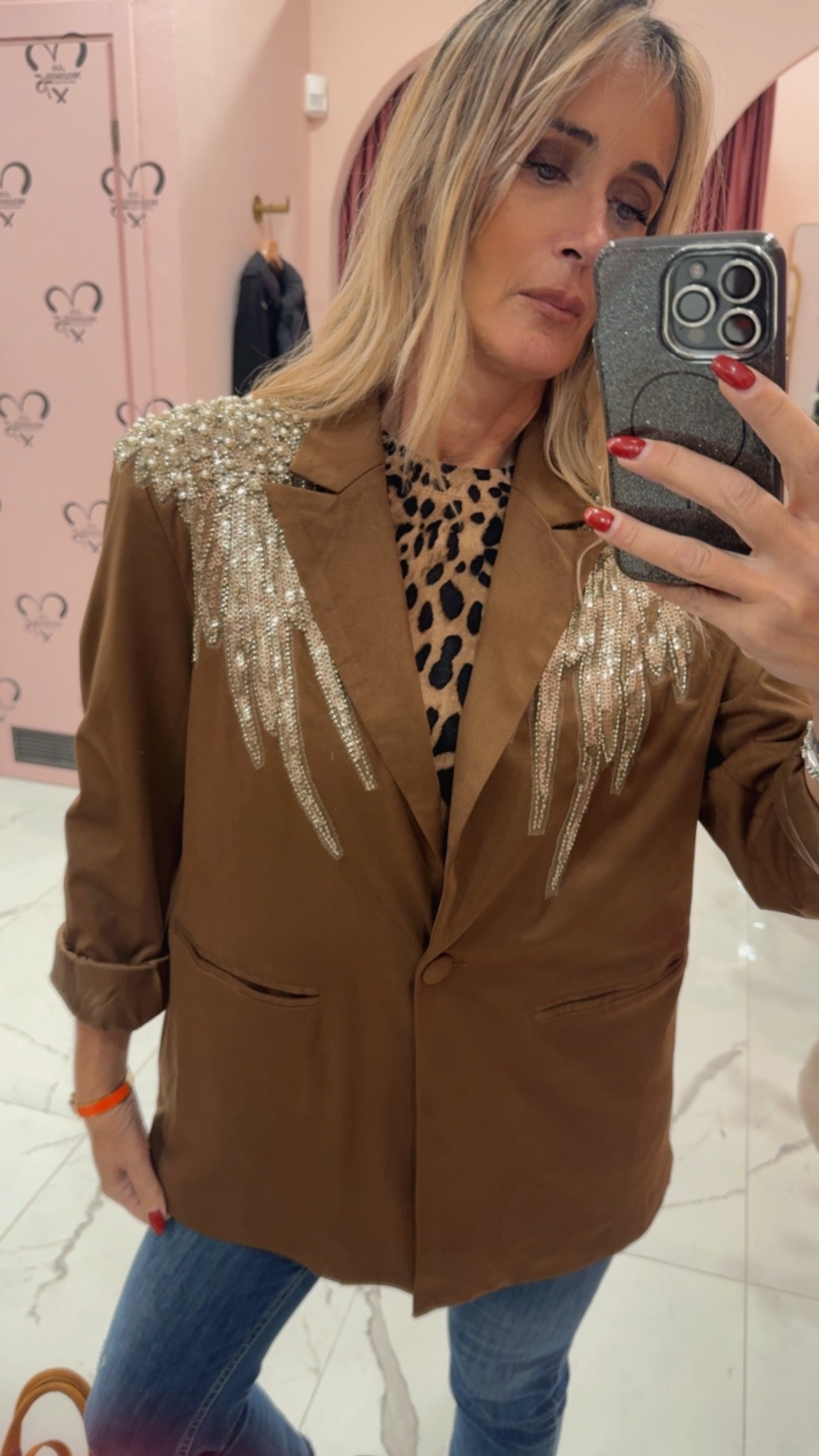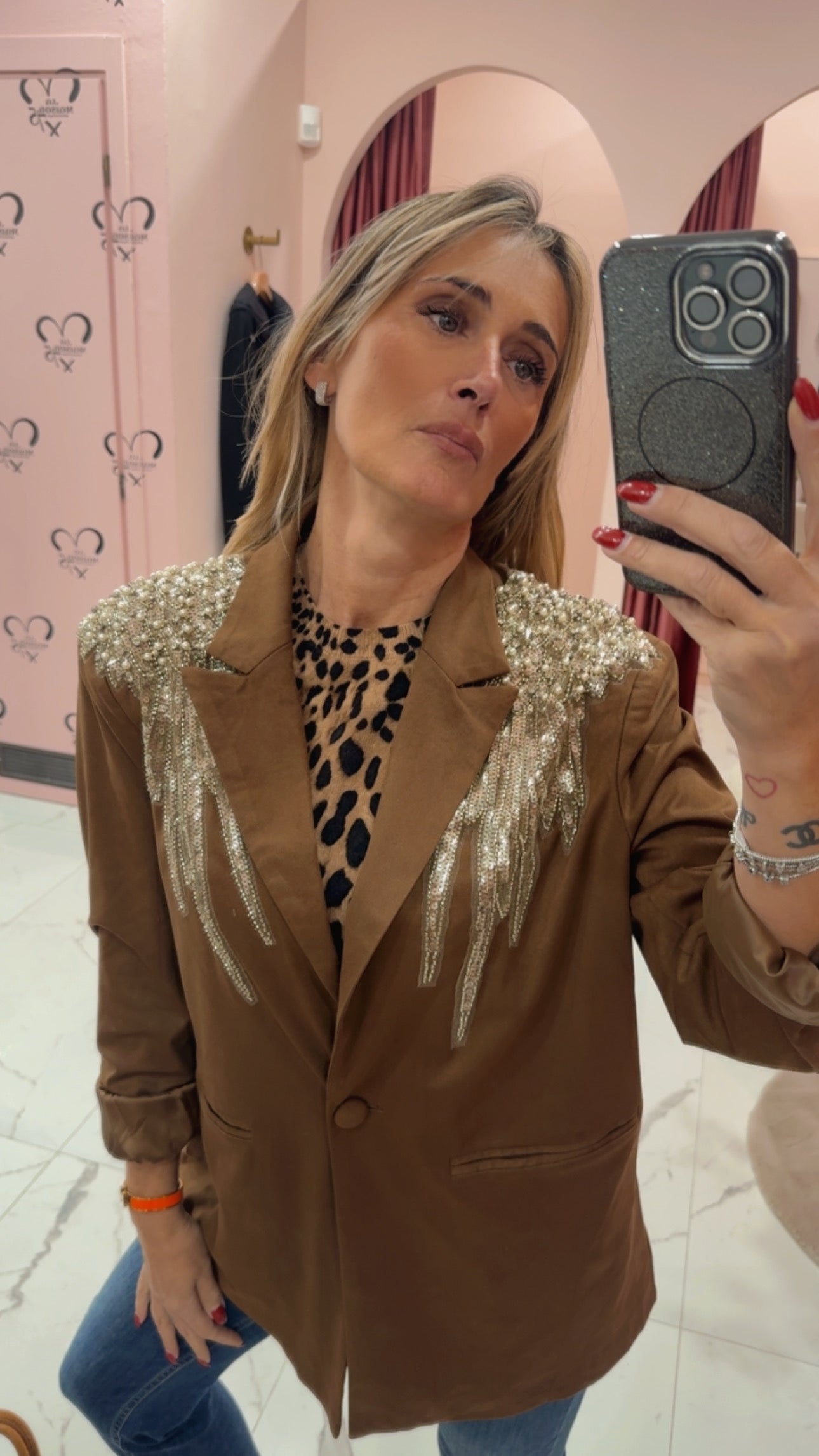 Giacca customizzata in eco daino con applicazioni perle paillettes