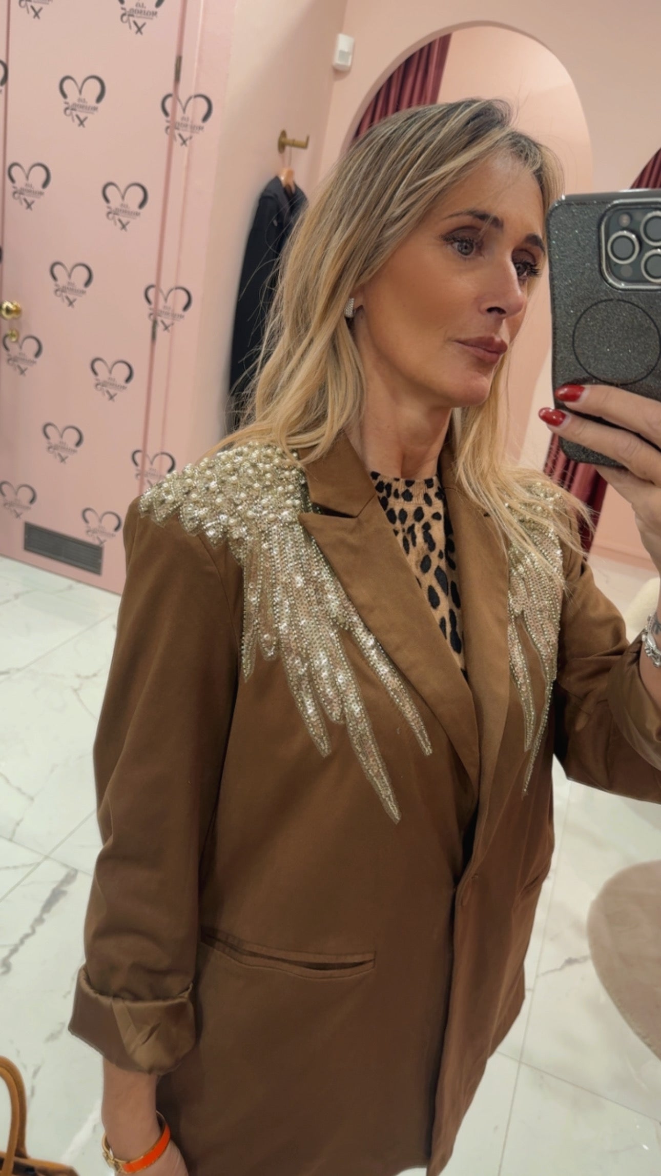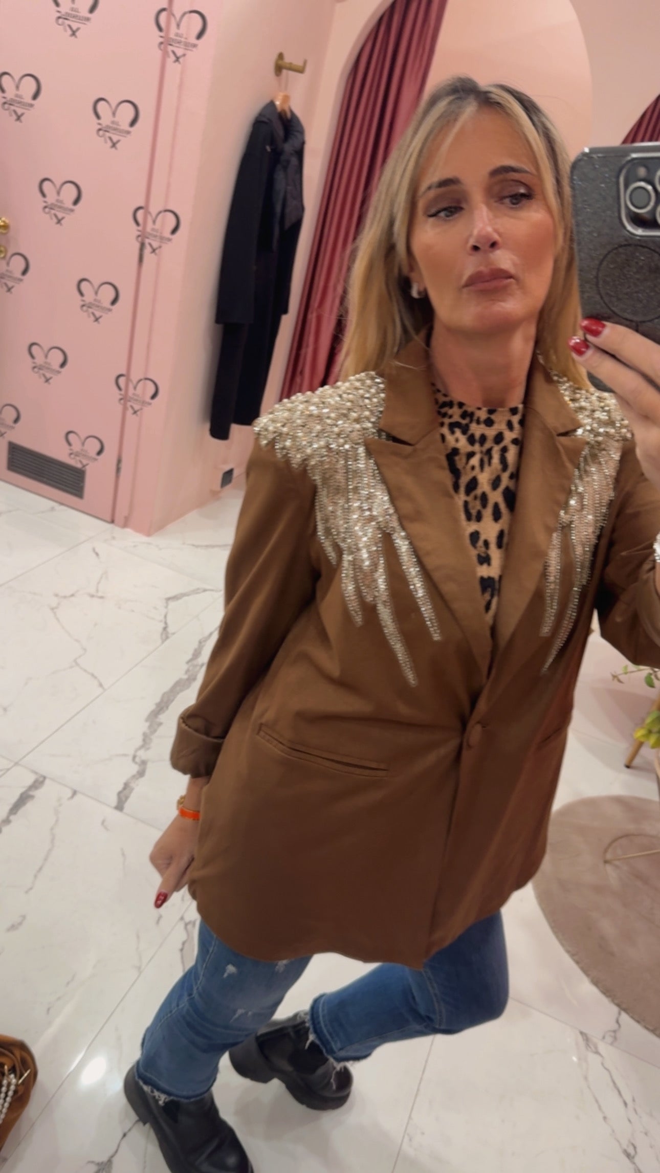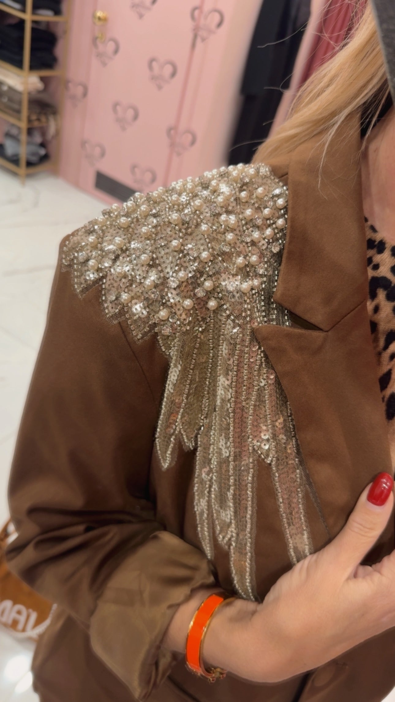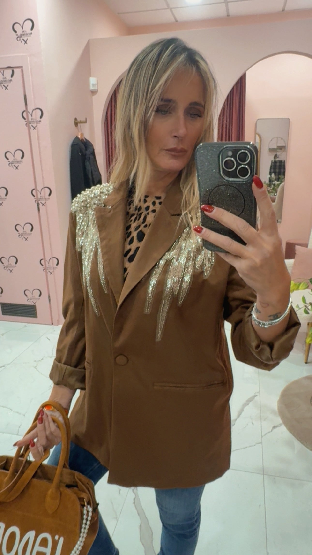 Giacca customizzata in eco daino con applicazioni perle paillettes