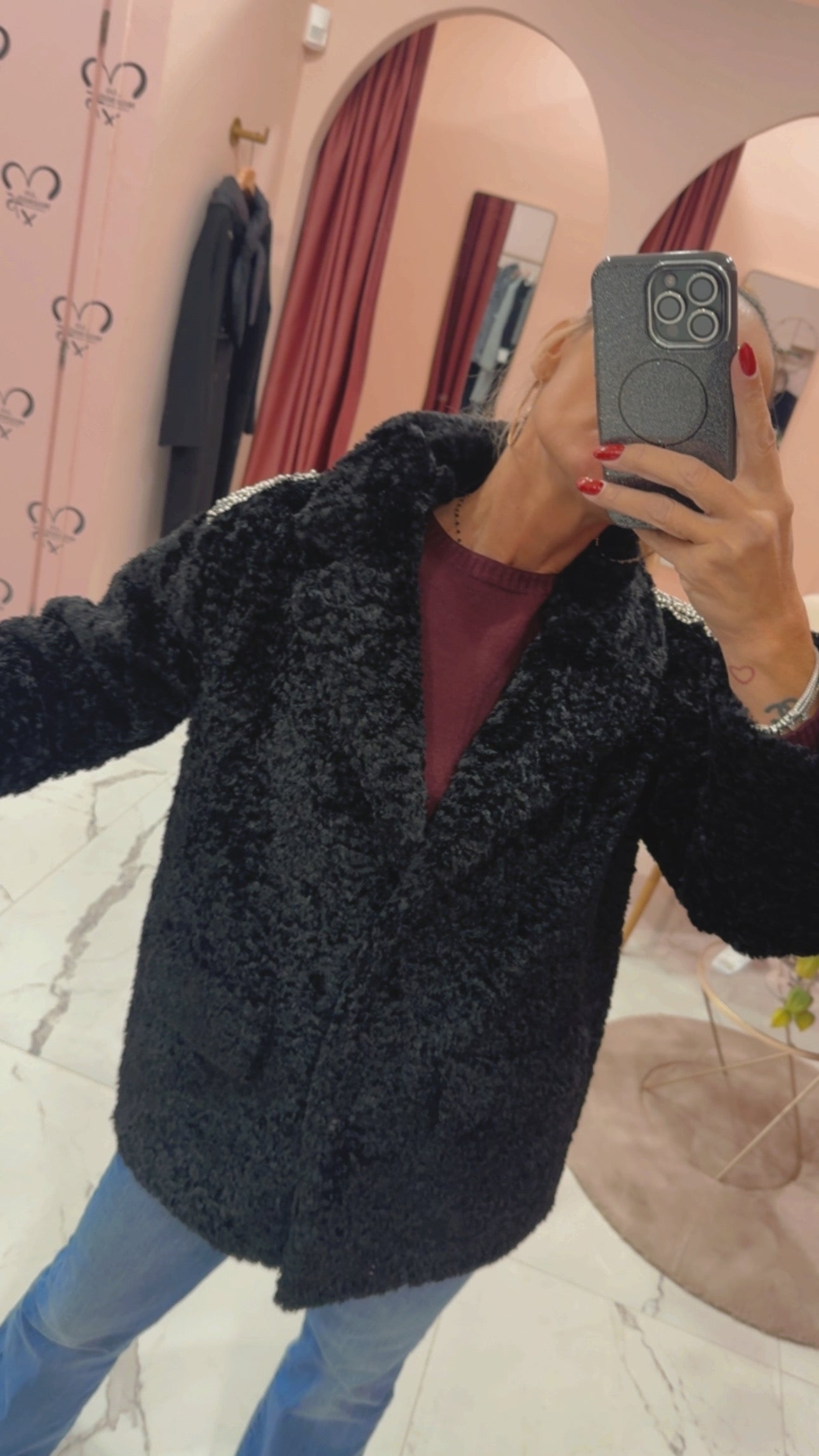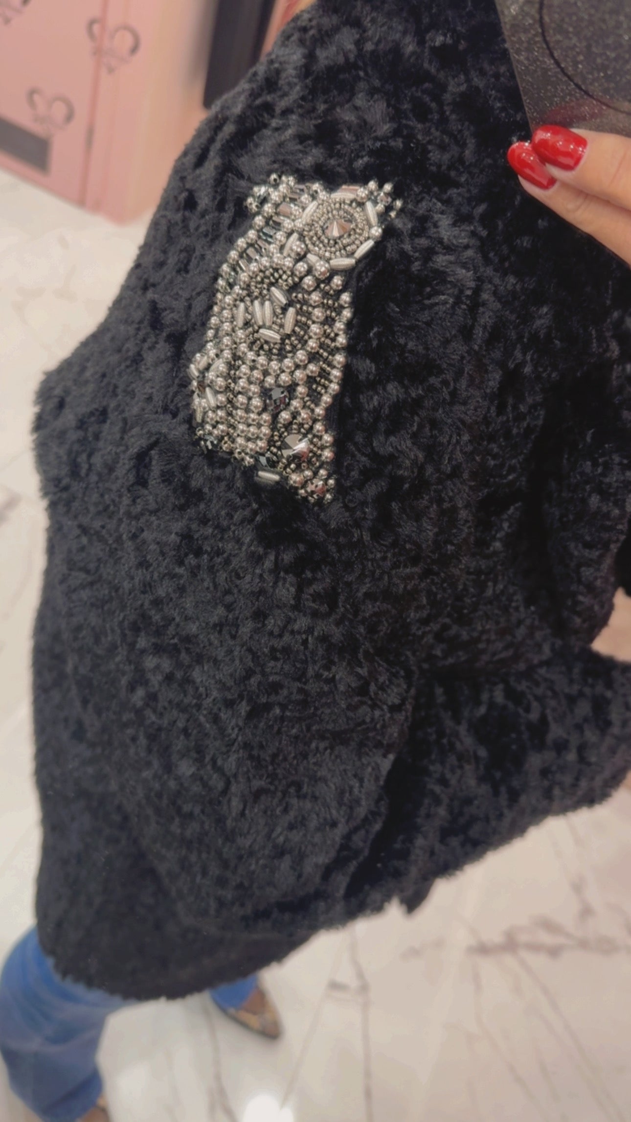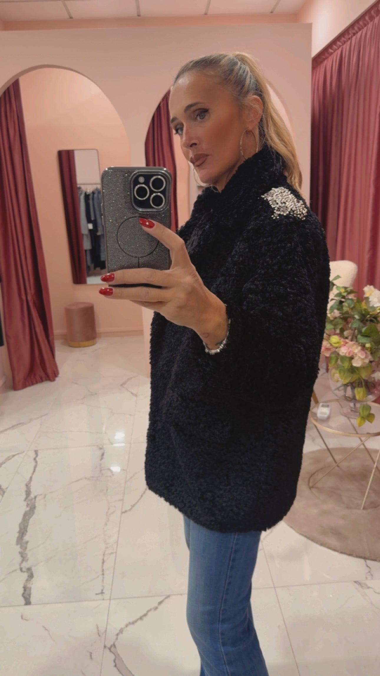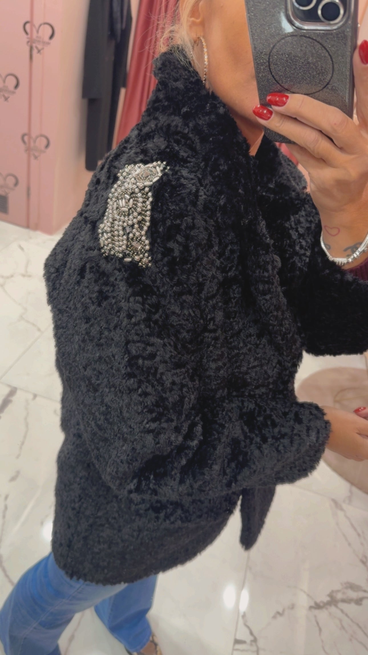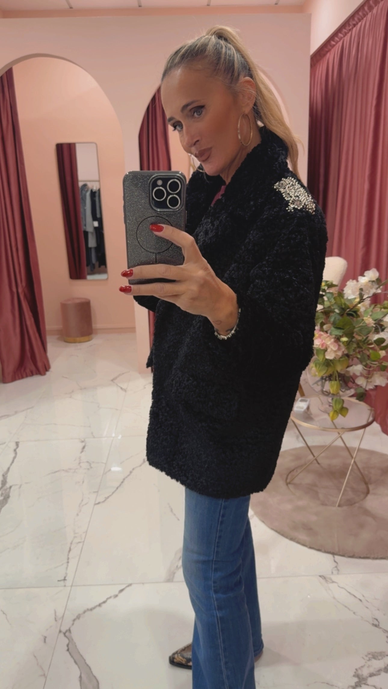 Giaccone eco astrakan con applicazioni gioiello sulle spalle