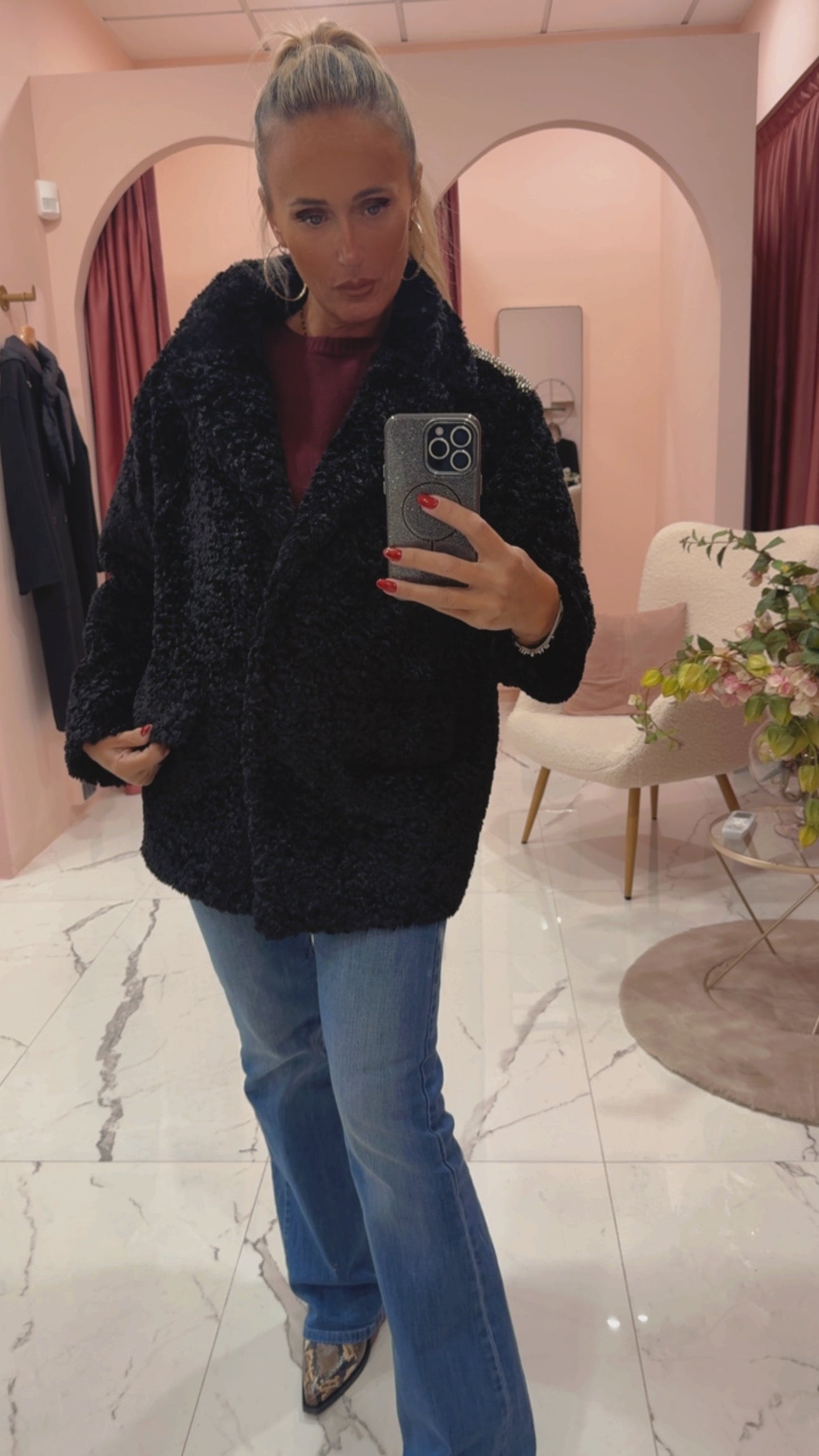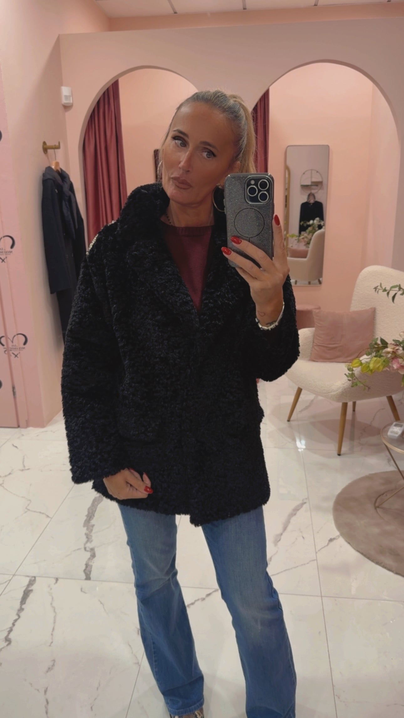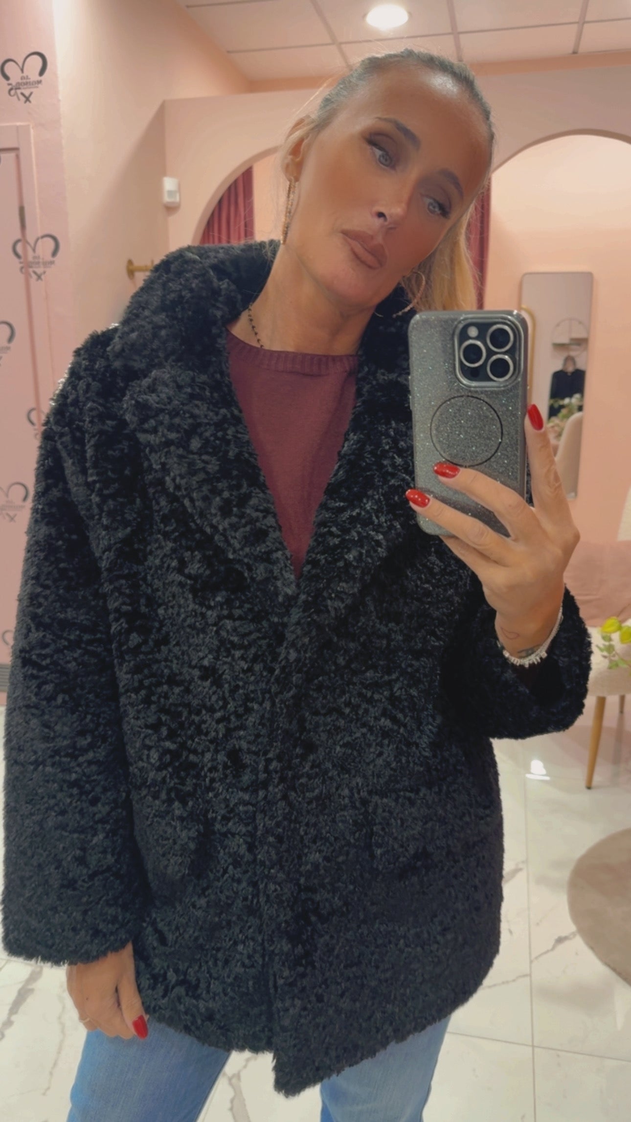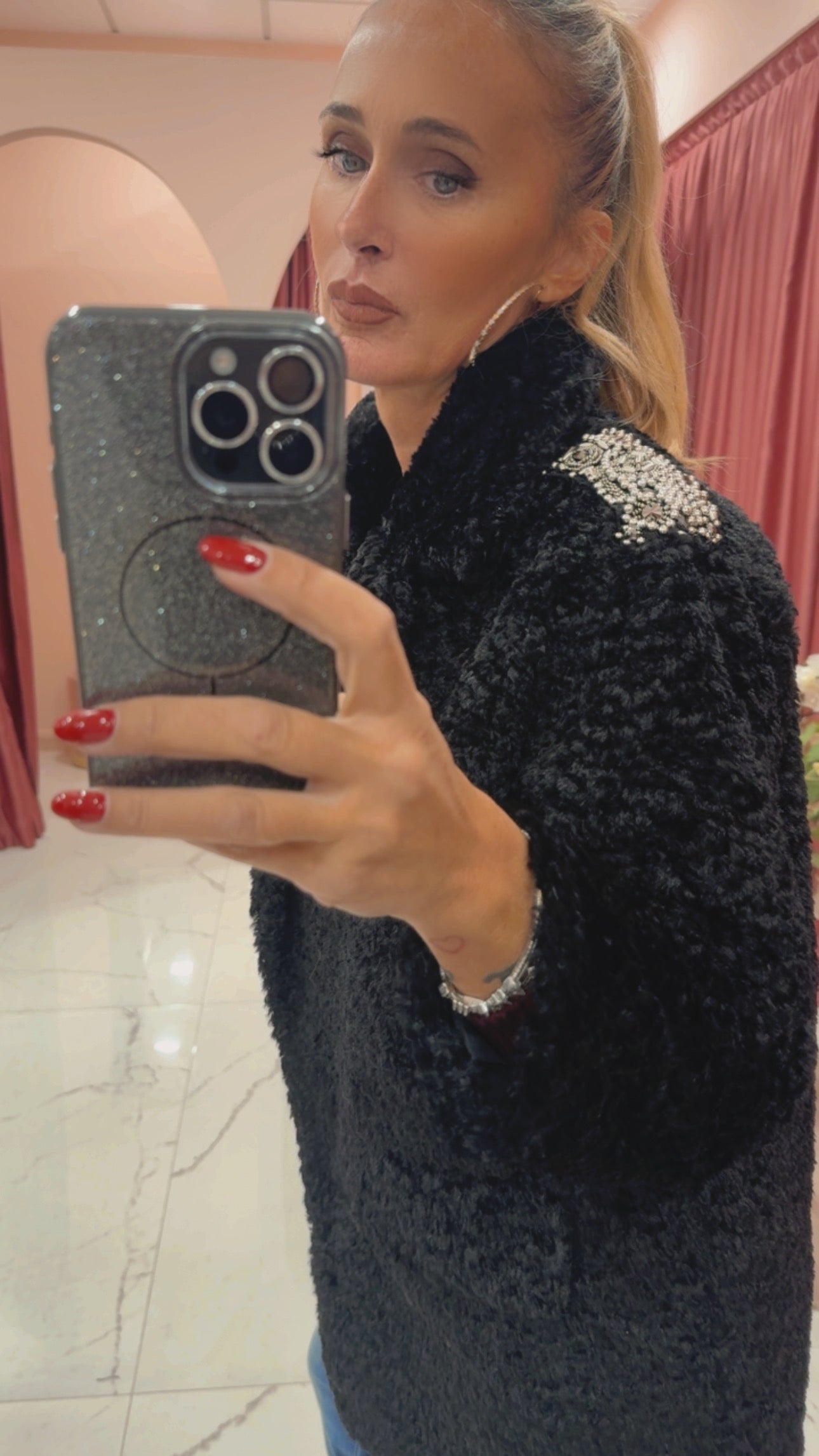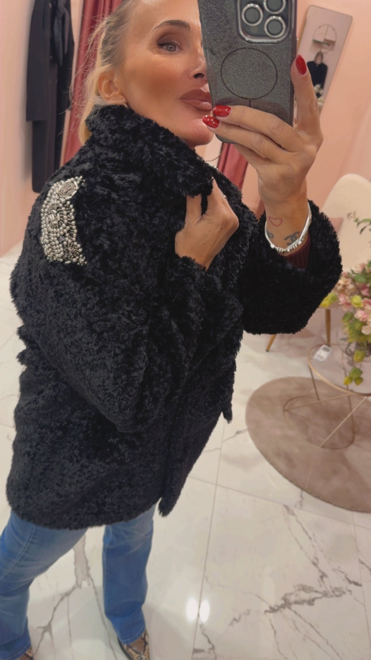 Giaccone eco astrakan con applicazioni gioiello sulle spalle